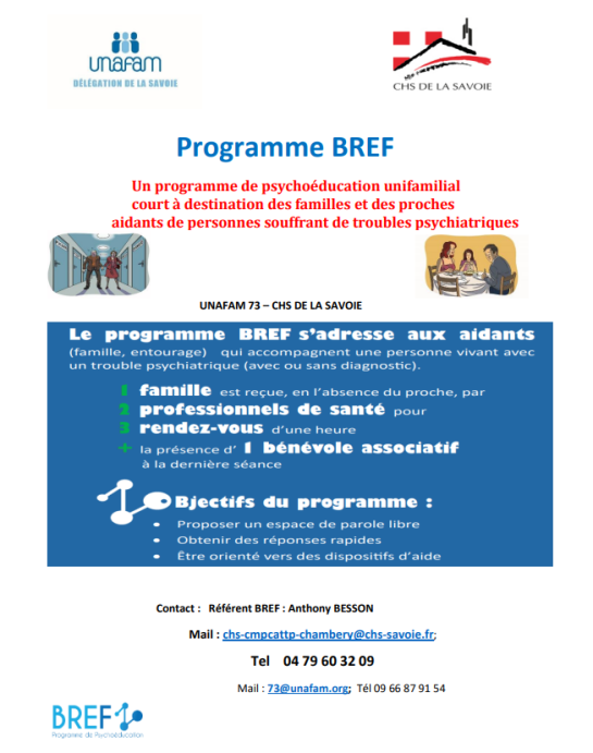 Le programme BREF s'adresse aux aidants (famille / entourage) qui accompagnent une personne vivant avec un trouble psychiatrique (avec ou sans diagnostic).