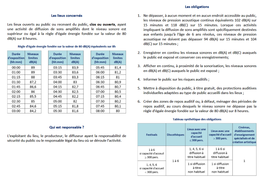 Afin de protéger le public des effets de l'exposition à des niveaux sonores très élevés, la règlementation fixe les niveaux à ne pas dépasser en tout lieu accessible au public diffusant des sons amplifiés :