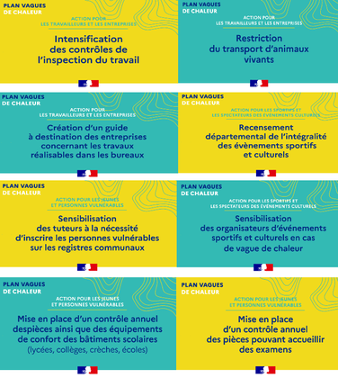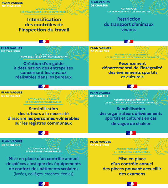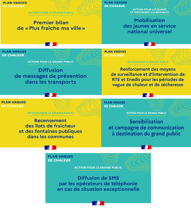 Création de pièces rafraîchies dans les écoles, diffusion de SMS en cas de situation exceptionnelle, recensement systématique des îlots de fraîcheur et des fontaines dans les communes, mobilisation des jeunes en services national universel pour mieux recenser les personnes vulnérables...