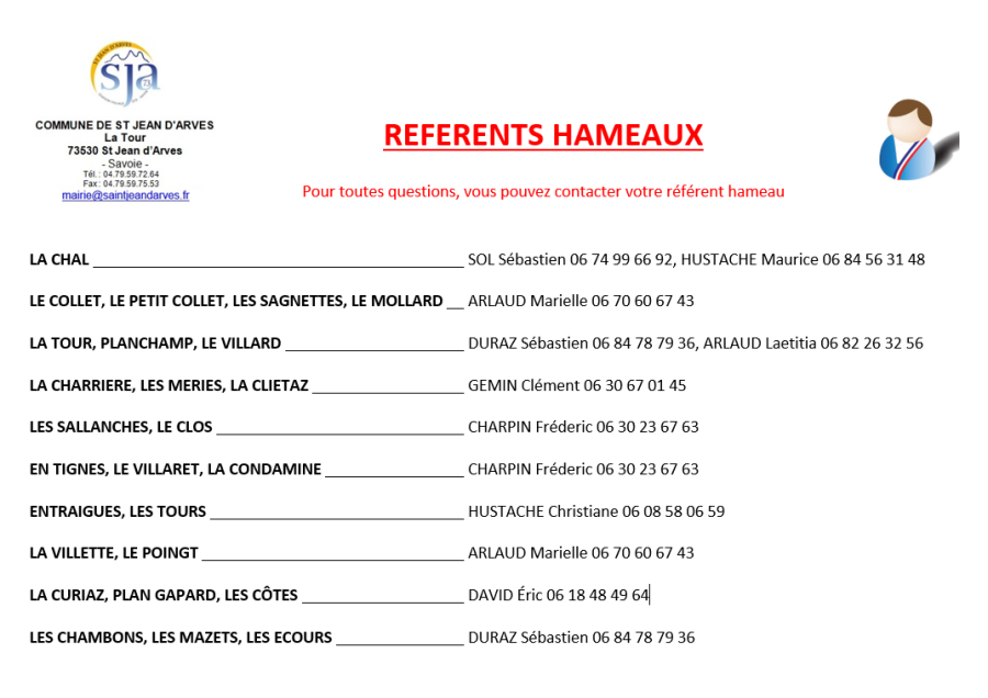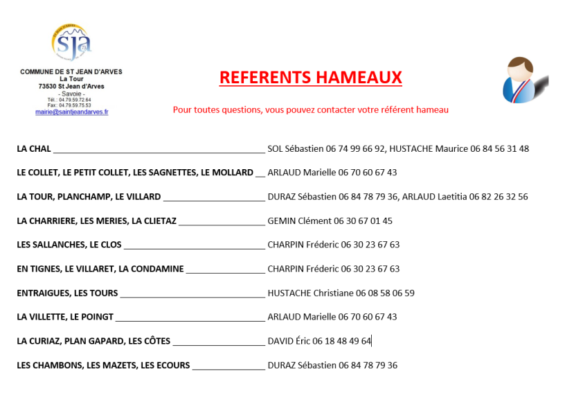 Référent des hameaux : Les Sallanches, Le Clos, En Tignes, Le Villaret, La Condamine.